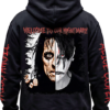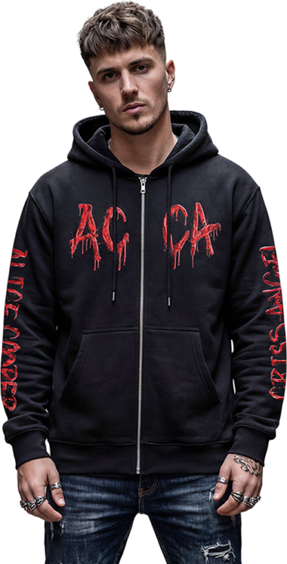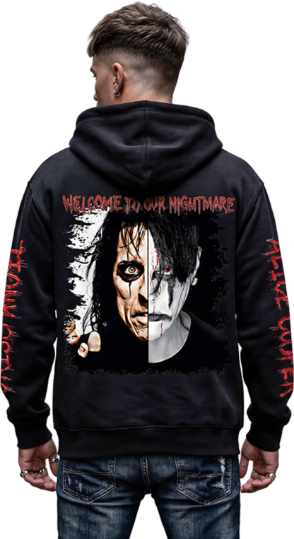 Full zip-up hoodie with AC/CA logo on front, Criss Angel on left sleeve, Alice Cooper on right sleeve, and Welcome to our Nightmare Keyart on the back. FABRIC: 8.0 oz. fleece, 80% ring-spun cotton/20% polyester, Reactive-dyed for longer-lasting color.